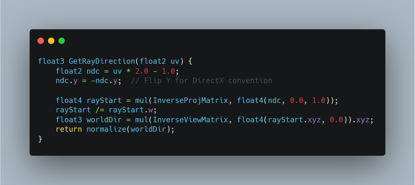 Each thread reconstructs a world-space ray from its screen coordinates using inverse view-projection: