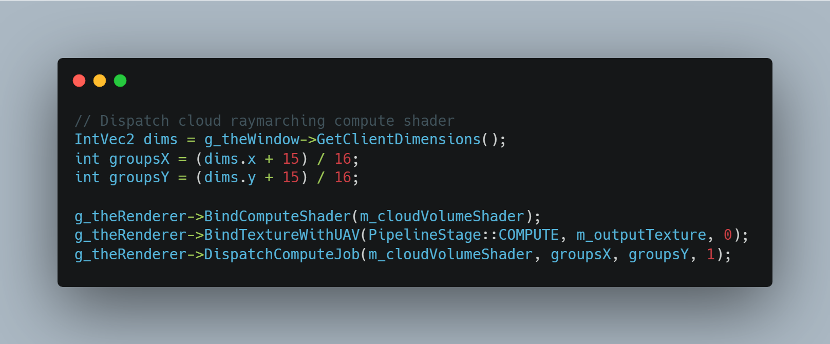 The cloud rendering executes as a full-screen compute shader dispatched in 16×16 thread groups: