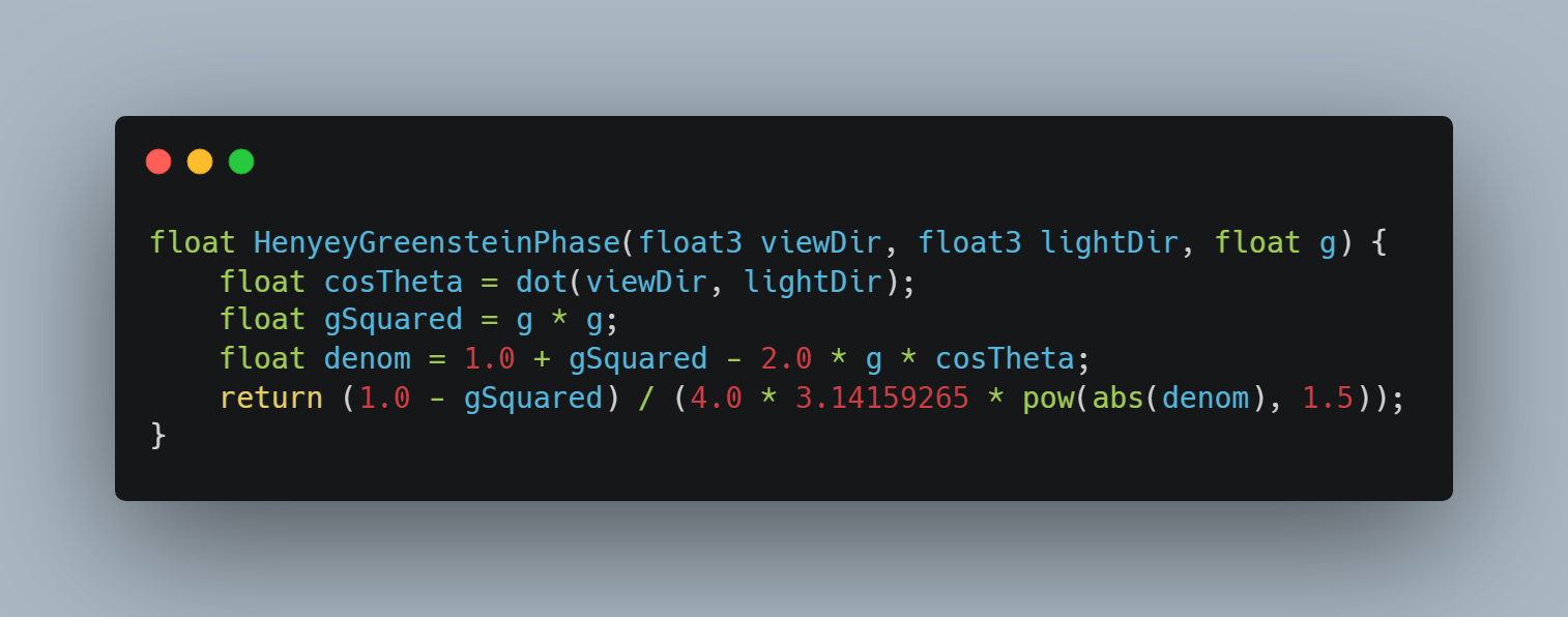 Physically-Based Scattering: Henyey-Greenstein phase function for anisotropic scattering, Beer-Lambert extinction, and powder effect approximation for realistic cloud illumination.