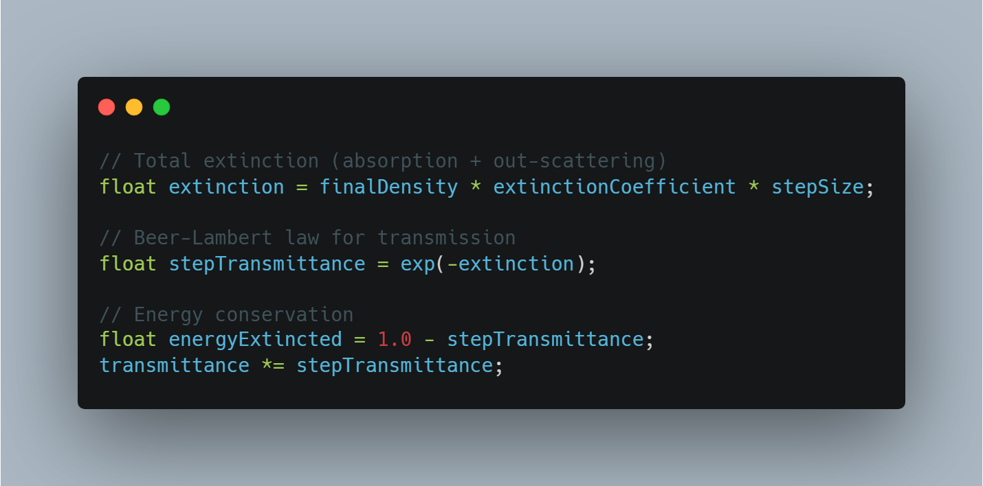 Initial shadow pass included phase functions and powder effects, producing incorrect self-shadowing.