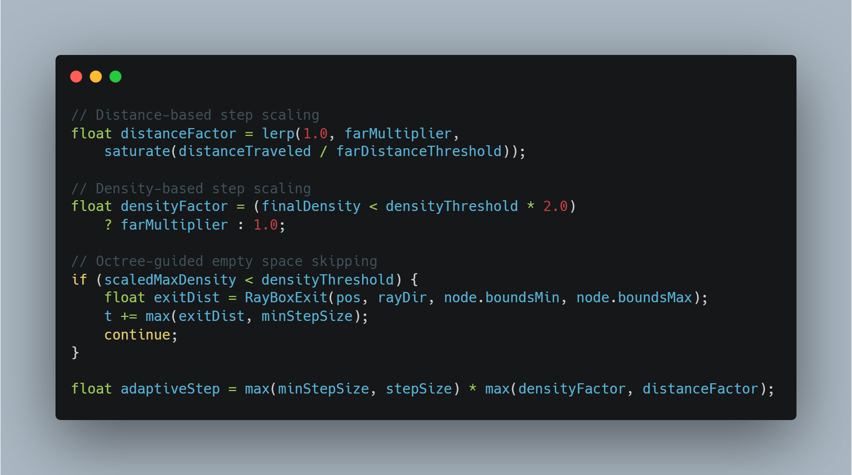 Naive fixed-step raymarching required 500+ steps per ray, causing GPU bottlenecks at high resolutions.